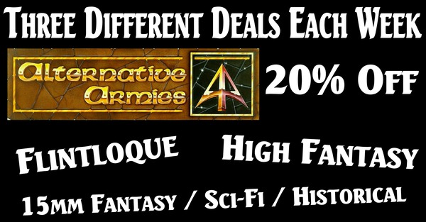 We have a trio of Weekly Deals which run Monday to Sunday each week. Each week three different offers all at 20% off normal price on all their options including painted and ready for play. We have a Flintloque deal, a High Fantasy deal and a 15mm scale deal. Get something for your wargaming and check them out every monday when they change. HERE.