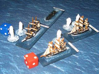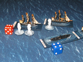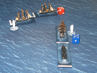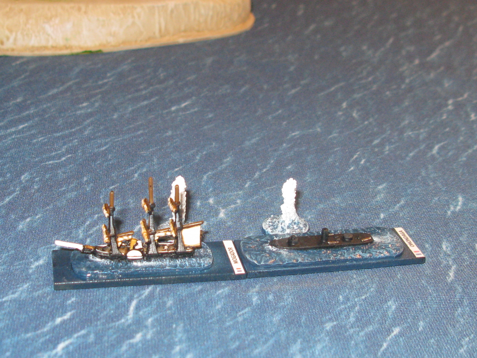 The battle reached a climax in Turn 6, as the Royal Navy made a last ditch attempt to knock out the Mogador before she could tow the Onondaga to safe waters. Unfortunately, both sides were hampered by low AP rolls, so were forced to decelerate to cruise speed. In the Royal Navy phase, the total of 4 AP was used to effect repairs, bringing both ships up to Damaged condition. The Onondaga fired on HMS Pallas and knocked her back down to Silenced straight away but HMS Rapid, with fire support from HMS Pallas, managed to Silence the Mogador in return (I had to do some head scratching at this point about damage results, but more about that later). In the French phase, the two ships nudged forward at basic speed, not wanting to risk a failed tow roll, but got away with it as HMS Rapid failed to hit the monitor in the fire phase. Not wanting to be unsporting, the Onondaga then failed dismally to hit HMS Pallas, despite being only yards apart and having both turrets levelled at the ironclad!