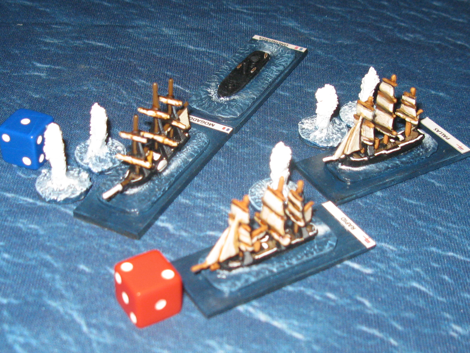 In the French phase of the turn, it was time to finish things for good, with yet another successful tow roll (!) pulling the Onondaga away from the impact and clear of HMS Pallas. In a last ditch attempt to slow the French escape, HMS Rapid fired an ineffective broadside on the Onondaga, only to be blown out of the water by the return fire of her heavy turret guns (the Onondaga scoring a total AF of 7 against a DF of just 1)! As the Shattered HMS Rapid slowly sank below the waves, HMS Pallas limped away, with steam pouring from her severed lines and her guns knocked out of action. The retreat of the Royal Navy left the French ships to limp into the bay, finally reaching the protection of the shore batteries.