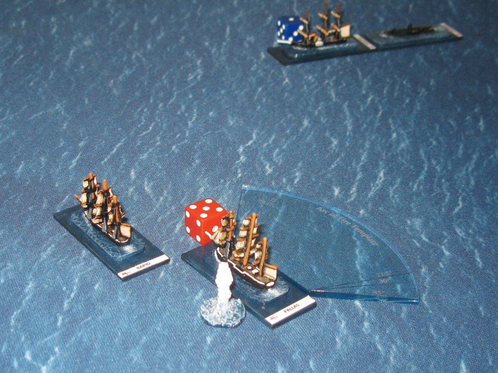 At this stage in the game, it was only a matter of a few inches before the French would get away and, with a hopeless AP roll of 2, the Royal Navy was running out of options. The Royal Navy squadron commander signalled HMS Rapid to break away to cut off the French escape route yet again, while at the same time ordering HMS Pallas to ram the Onondaga amidships with a 15 degree turn to starboard bringing her onto a collision course. The Onondaga blasted HMS Pallas on the way in but she struck her target slap bang in the port side nonetheless. Unfortunately, but quite realistically given her faulty design and low speed, the resulting damage to Onondaga by the ironclad ram was relatively ineffective, resulting in only Damaged outcome.
