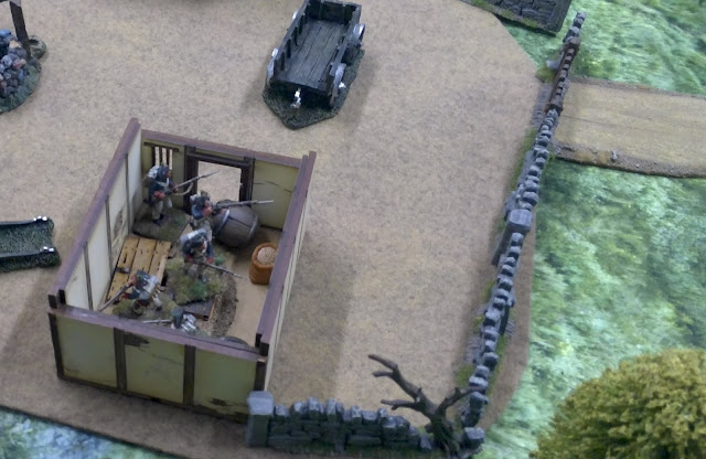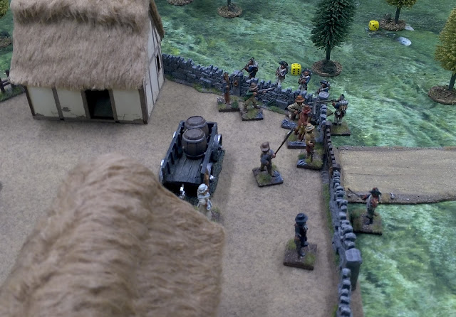 Der siegesgewisse Fourier wird nun etwas übermütig und wähnt sich bereits als Herr der Lage. Als er sich einen ersten Schluck Bier gönnen will, wird er von drei Männern aus dem Dorf überrascht und niedergestreckt. Seine Leute sind zu weit entfernt, um ihm noch rechtzeitig zu Hilfe zu eilen. Sie geben aber routiniert eine weitere Salve ab und vertreiben damit die Bauern wieder aus dem Dorf.