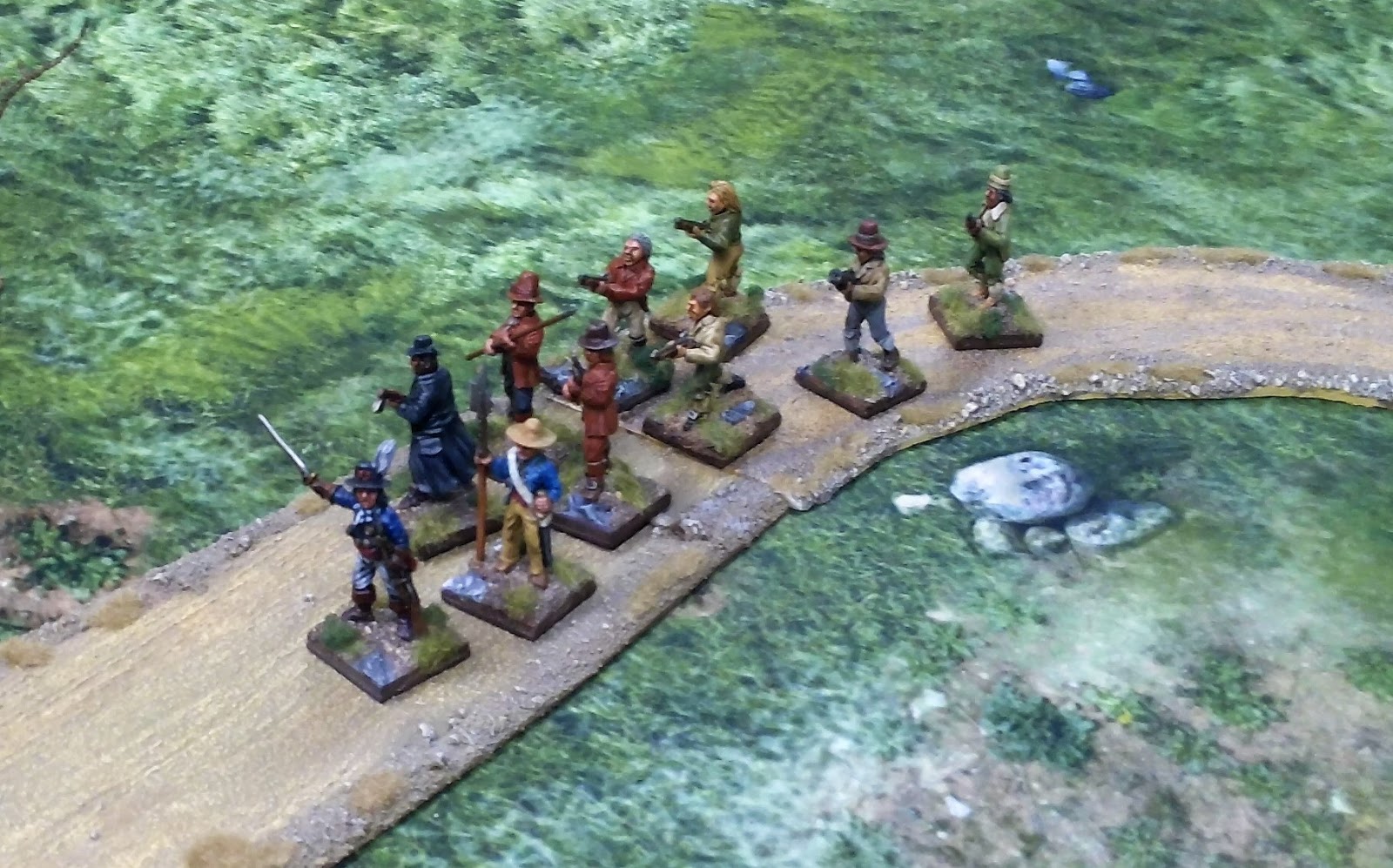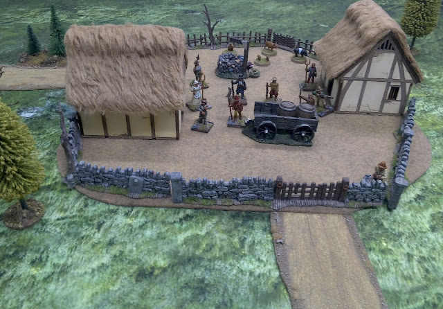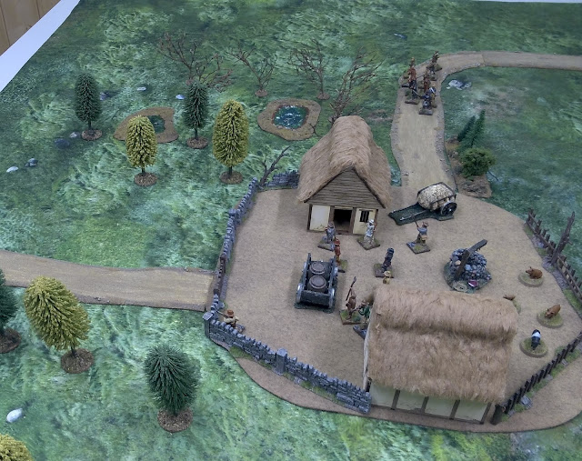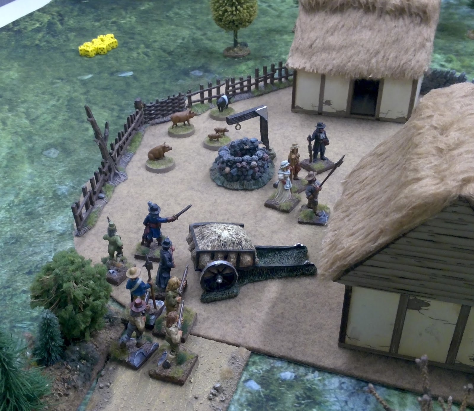 Das Szenario haben wir schnell und kurz aus dem Ärmel geschüttelt für ein kleines Spiel am Abend. ‚Chosen Men‘ bietet auch so eine gute und schnelle Möglichkeit. Die Armeelisten hatten wir schnell zusammengestellt. Die Franzosen wurden nach dem Eintrag für leichte Infanterie zusammen mit einem Offizier ausgewählt. Den Landsturm spielte ich nach dem Eintrag für Portugisische Miliz. Ausgerüstet waren die Modelle WYSISWYG, sprich, nur wer eine Schusswaffe trägt, kann auch eine benutzen. Die Nahkampfwaffen haben wir gemäss den Regeln dargestellt. Da die Miliz bei Nahkampf und Moral schlechter ist, als die ausgebildeten Soldaten ist das Verhältnis auf dem Tisch auch 2:1. Von den Punkten her waren die Franzosen klar im Vorteil, da sie noch den Offizier ins Feld führten. Da aber Szenarios nicht unbedingt fair sein müssen, passt das schon. Das Ziel der Franzosen war es auch, möglichst viel Fourage zusammenzutragen, bevor die Berner Soldaten auftauchten. Wir setzten daher auch eine zufällige Länge von 5+ Spielzügen fest. Sie tauchten dann schlussendlich auch in Zug 9 oder 10 auf und benötigten dann nochmals 3 Züge im Laufschritt bis zum Dorf.