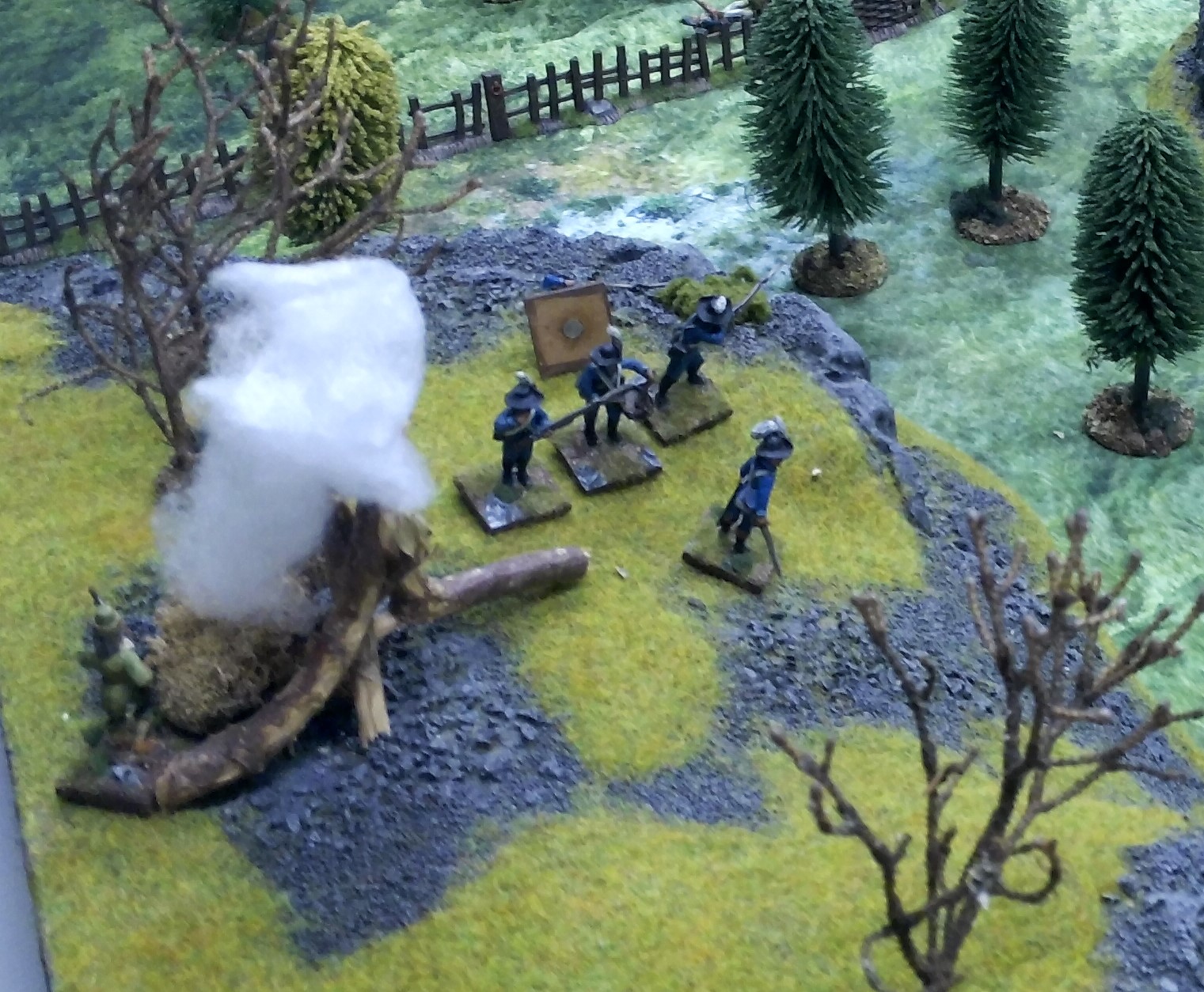 Die Scharfschützen stoppten den Vormarsch der Franzosen mit gezieltem Feuer aus ihren Stutzern. Sie hatten gerade noch rechtzeitig einen kleinen Hügel über der Strasse erreicht und sich verschanzt. Die Franzosen waren von der einsetzenden Gegenwehr einen Moment überrascht, versuchten aber schnell, die Stellung zu flankieren. Damit wären sie genau in den Weg der Bauern gelaufen. Schnell handelte der Leutnant der Scharfschützen und eilte mit dem zweiten Trupp in die gefährlich offene Lücke.