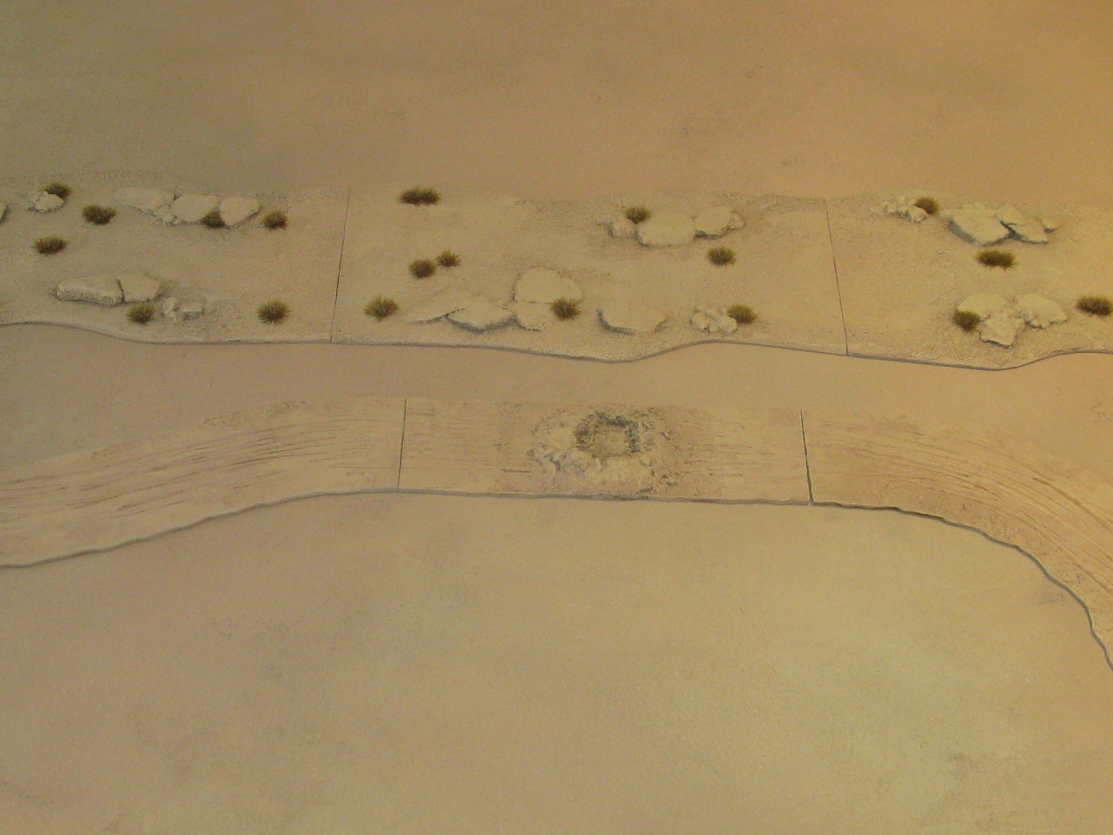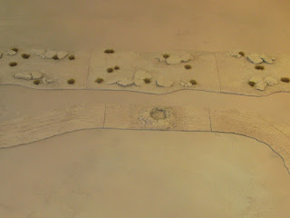 I’ve finished off the wadi sections for the Sandbox Skirmish project and also given the dirt tracks a final drybrush to wrap them up at the same time. The wadi pieces have had some tufts added but I decided not to add any reeds or clutter, so that they store without getting damaged and are useable with 15mm, 20mm and 28mm figures. I now need to make some ‚pie wedge‘ corners so that he wadi can be made to bend a bit, as it looks a bit too linear, together with the road junctions, crossroads and a few short pieces to bridge any gaps. I’m a bit tired of terrain, however, so will be taking a break to concentrate on the 1/600th scale planes for the Football War project instead.