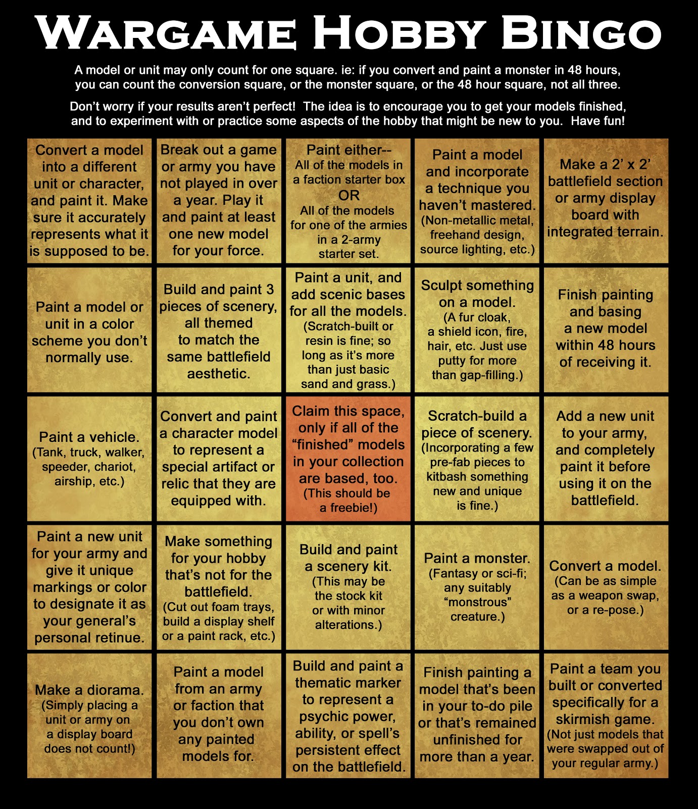 This year, I decided to update my Wargame Hobby Bingo card. A few squares got a bit of a tweak, and some are brand new: