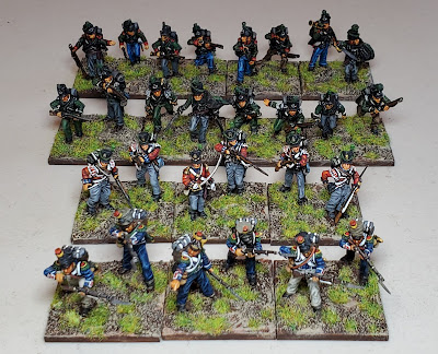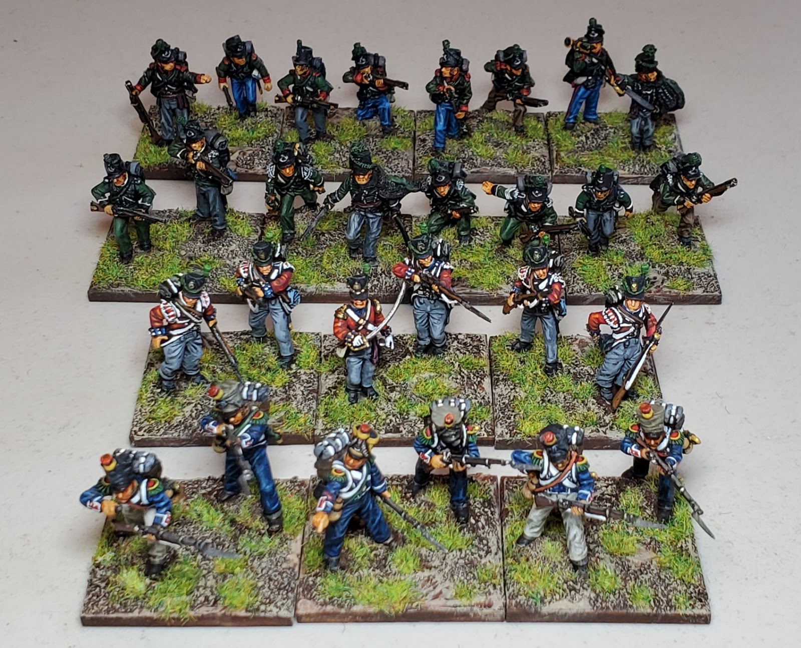 And…I went ahead and re-based the skirmishers which will be used in the scenario the same way. For some, like the Voltigeurs and British Rifles, it was their fourth re-basing. I only managed to slightly puncture a thumb during the re-basing process.