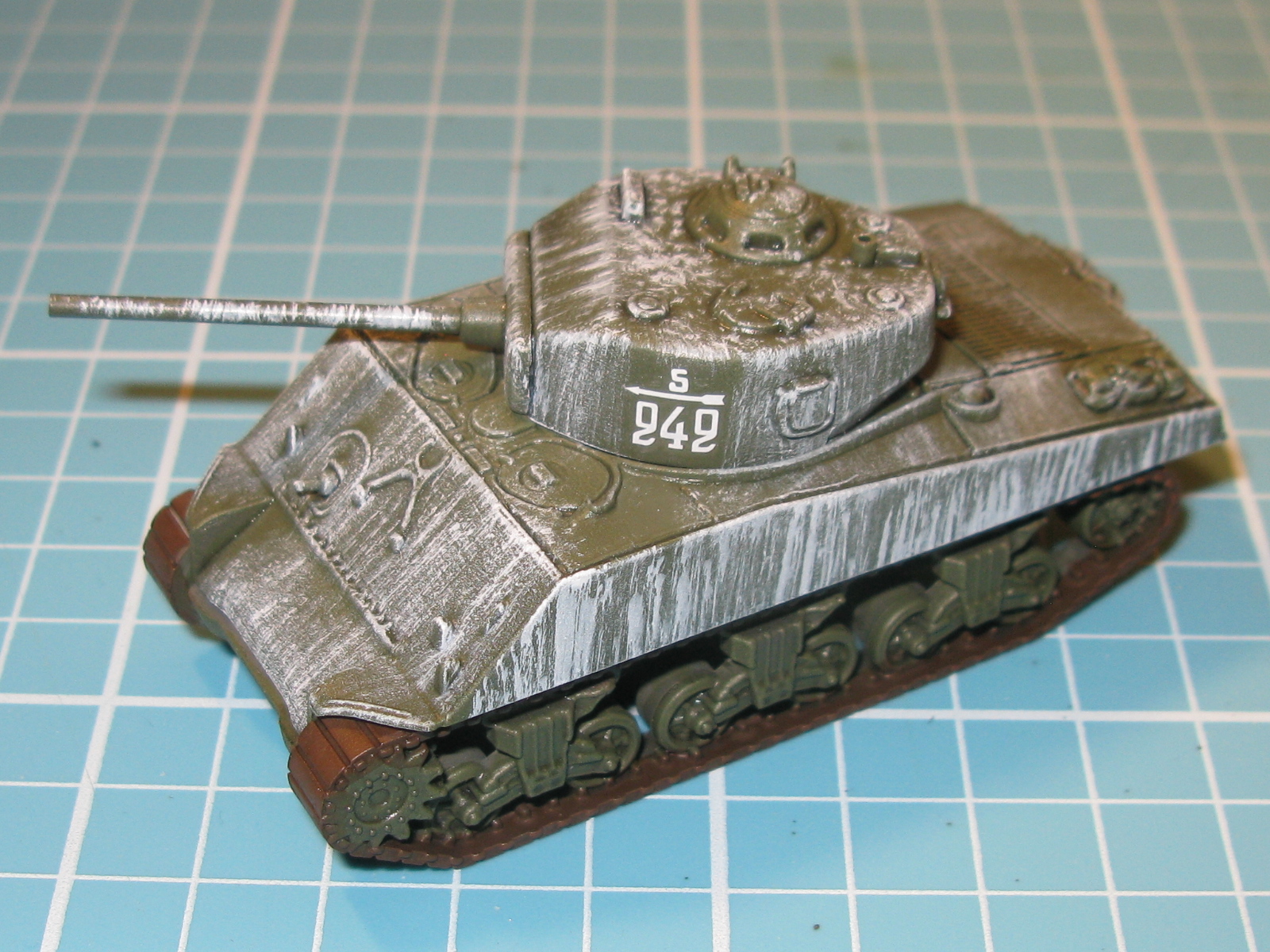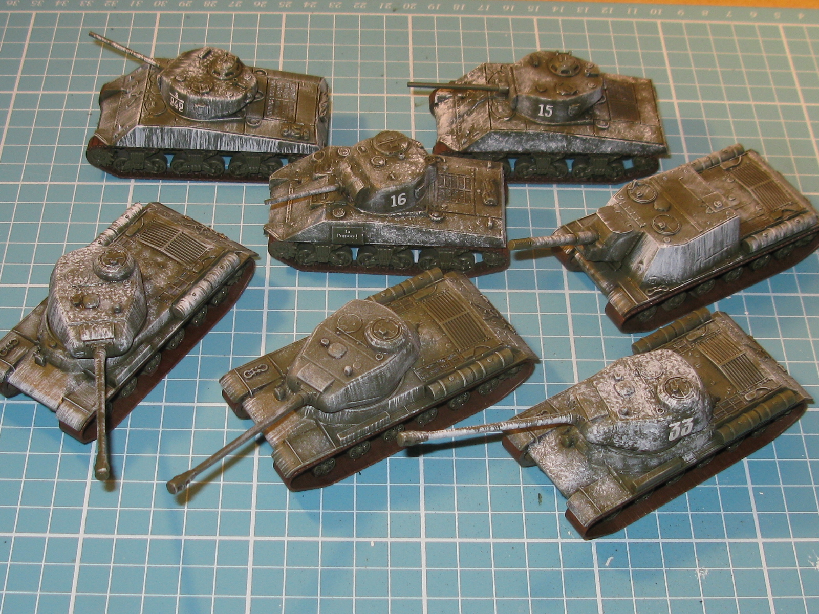 I painted the tracks this afternoon then added some decals, which were a right pain as they didn’t behave themselves, before deciding to crack on with the winter whitewash camouflage. This ended up being a bit rushed but it looks good enough for wargaming purposes, so it will have to do. I still need to do some washing and highlighting, add some decals over the winter camo on a few of the tanks, paint the road wheel tyres and finish off with some weathering, but this will have to wait until next weekend. I’m now wondering it I should have just gone for the Russian Green scheme, as it was looking better than the snow camo end result, but you live and learn!
