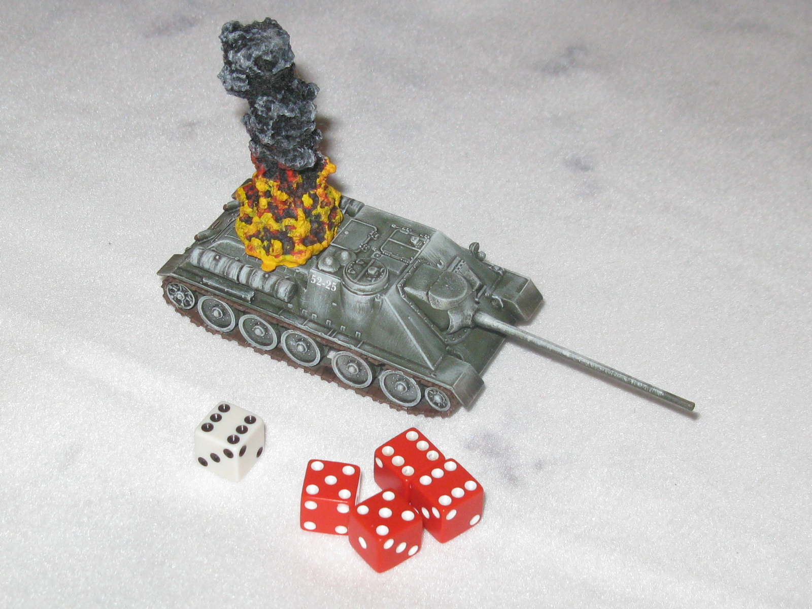 In the end, the firepower of the Tiger overcame the armour of the SU-85, which was destroyed but not before the crew bailed out. I really enjoyed both games and will probably set up another one for the kids at some point over the weekend. I think that 1/72nd scale is the perfect size for this set of rules, allowing for some not unrealistic ranges and plenty of manoeuvring. I’m also a convert to Tank Destroyers, which in the case of the SU-85 have a very handy TANK DESTROYER aim dice bonus and a FAST bonus too.