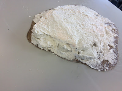 Plaster was poured onto a crumpled carrier bag* and when dried broken into chunks. These would form an interesting rocky outcrop that could be sloped down to the base, allowing access to the mill. Using a piece of 2mm MDF as a base, I loosely placed the pieces of plaster to form the rocks, bolstered by off cuts of insulation from to give me the basic structure.