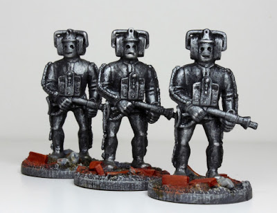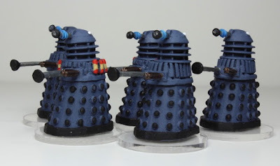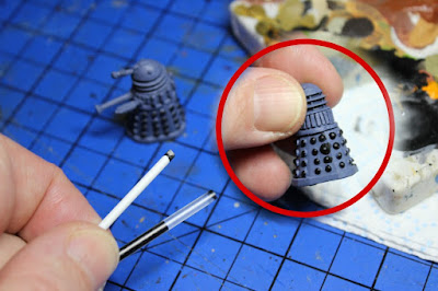 With the Doctor and his robotic companion K-9 completed my attention turned to the most iconic of the Time Lord’s adversaries, the Daleks! Relatively simple in principle, I had been advised that using a small tube dipped into paint would speed the process up no end. Sadly for me, the innards of a Bic biro proved just a little too wide in diameter, but some styrene tubing proved more suitable and so the initial setback was soon forgotten as I raced on to the Cybermen.