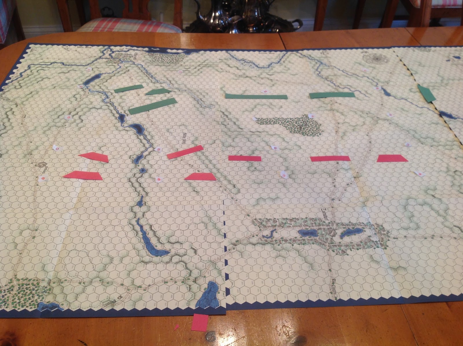 The maps have hexes overlayed on them, which follows the convention of most board games. So I had to create a ground scale of sorts in order to convert the COA map into a wargame table top. After a couple of iterations using different scales, I settle on each hex representing 4-inches of game table area.